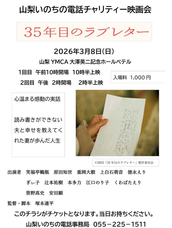 NEW! ★自殺予防講演会(講師サイン会あり)は終了いたしました ★チャリティーコンサートは終了しました 2021/4/17更新 山梨いのちの電話 事務局